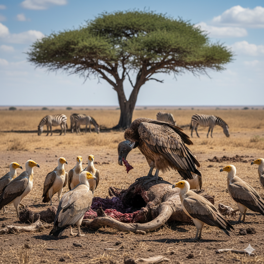 - Saneamiento ambiental: Las especies necrófagas (carroñeras), como los buitres, eliminan cadáveres del campo, evitando la contaminación del agua y la propagación de bacterias como el ántrax o la tuberculosis.