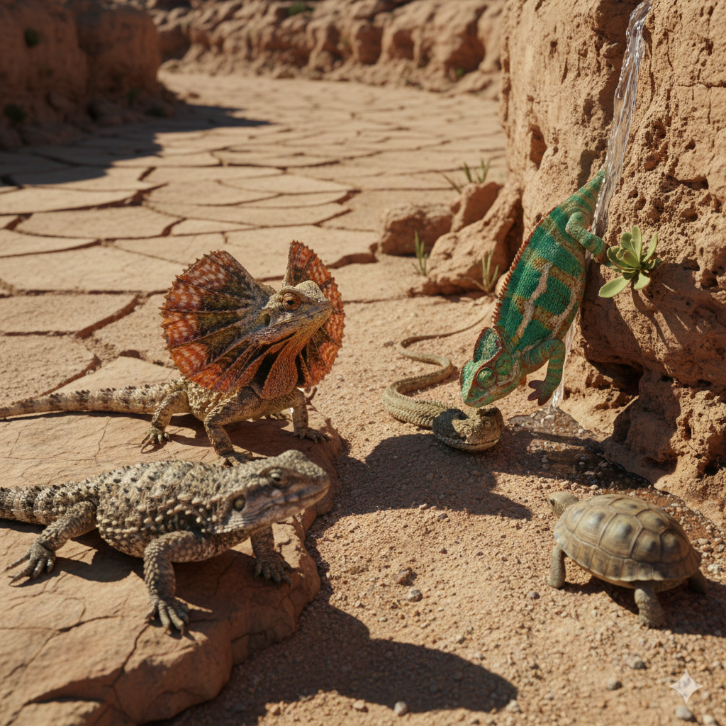 - Ectotermia (Sangre Fría): Son animales de «sangre fría» o ectotermos, lo que significa que regulan su temperatura corporal a través de fuentes externas (como el sol o una roca caliente). Esta característica les permite sobrevivir con menos alimento que un animal de sangre caliente de tamaño similar.